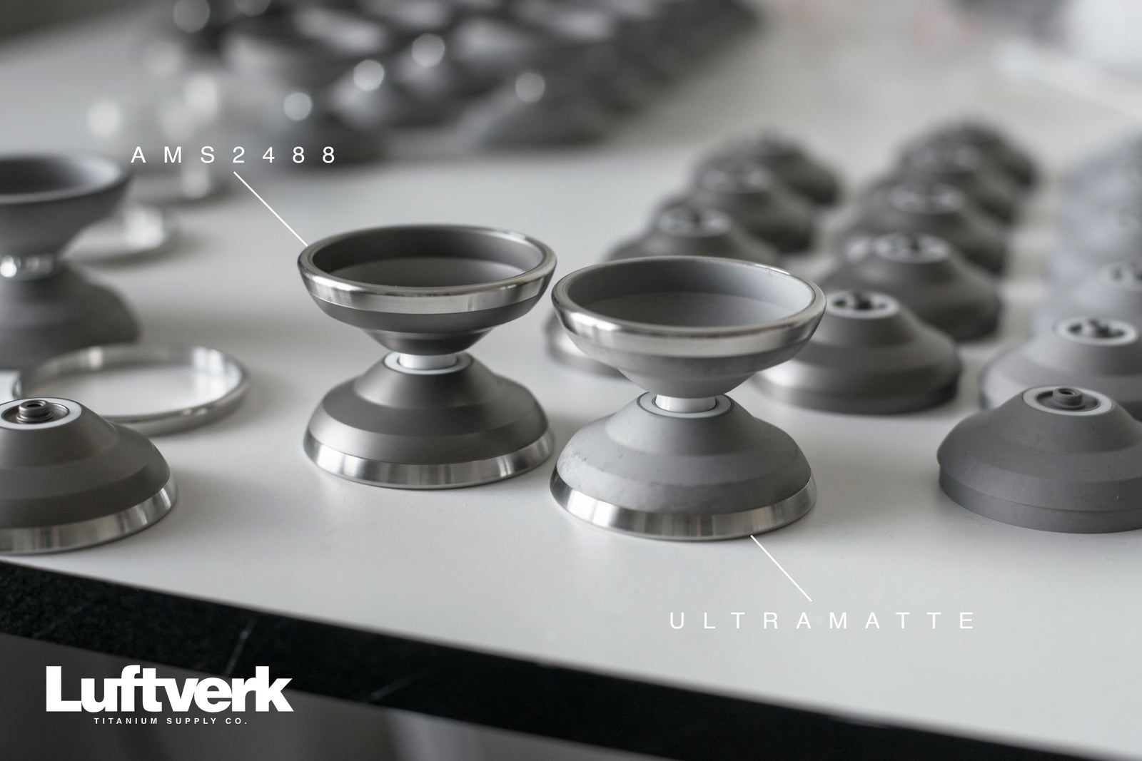 I get a lot of questions asking about these two very different finishes. I figured it would probably make sense to have a specific blog post regarding this I could link to in the future. Both Ultramatte and AMS2488 are titanium specific coatings, generally reserved for fasteners in the aerospace and medical industry but their functions as a coating for yoyos are very different.